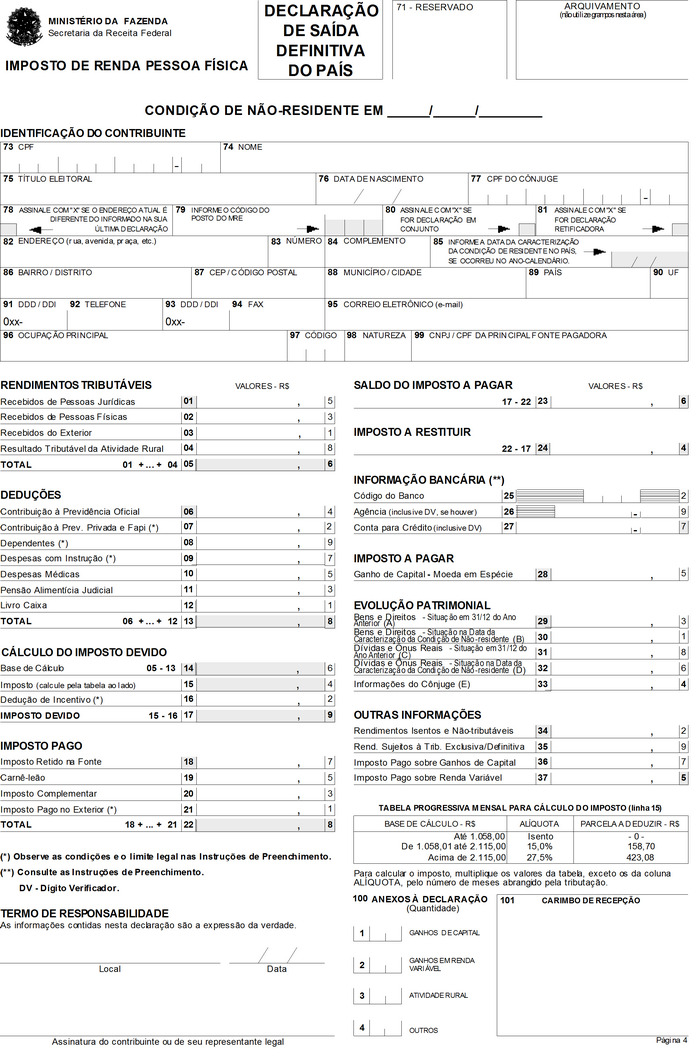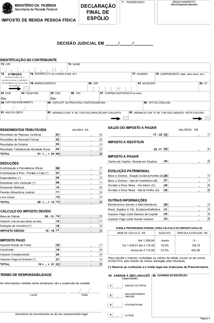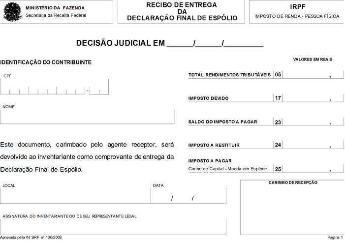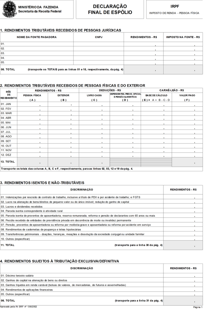 O SECRETÁRIO DA RECEITA FEDERAL, no uso da atribuição que lhe conferem os incisos III e XVIII do art. 209 do Regimento Interno da Secretaria da Receita Federal, aprovado pela Portaria MF no 259, de 24 de agosto de 2001, e tendo em vista o disposto no art. 16 da Lei no 9.779, de 19 de janeiro de 1999, e nas Instruções Normativas SRF nº 73/98, de 23 de julho de 1998, nº 146/98, de 11 de dezembro de 1998, nº 167/99, de 23 de dezembro de 1999, e no 81, de 11 de outubro de 2001, resolve: Art. 1º Ficam aprovados os modelos de formulários para: I - a Declaração Final de Espólio, no formato A4 (210mm x 297mm), com quatro páginas (Anexo I); II - o Recibo de Entrega da Declaração Final de Espólio, no formato A5 (148mm x 210mm), com duas páginas (Anexo II); III - a Declaração de Saída Definitiva do País, no formato A4 (210mm x 297mm), com quatro páginas (Anexo III); IV - o Recibo de Entrega da Declaração de Saída Definitiva do País, no formato A5 (148mm x 210mm), com duas páginas (Anexo IV). Art. 2º Esta Instrução Normativa entra em vigor na data de sua publicação. Art. 3º Fica formalmente revogada, sem interrupção de sua força normativa, a Instrução Normativa SRF nº 8, de 24 de janeiro de 2001. EVERARDO MACIEL Anexos