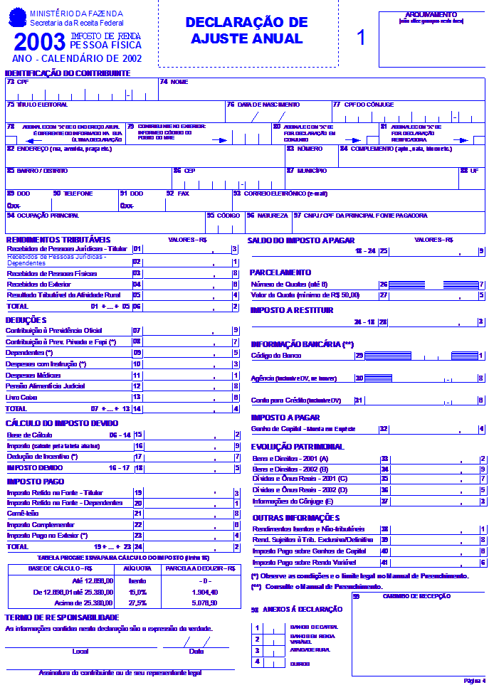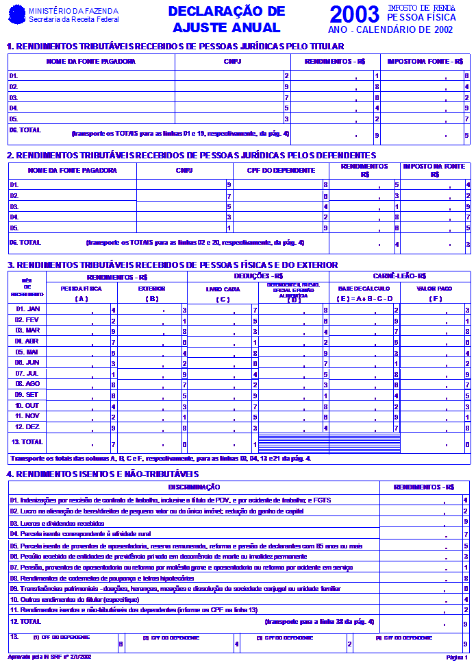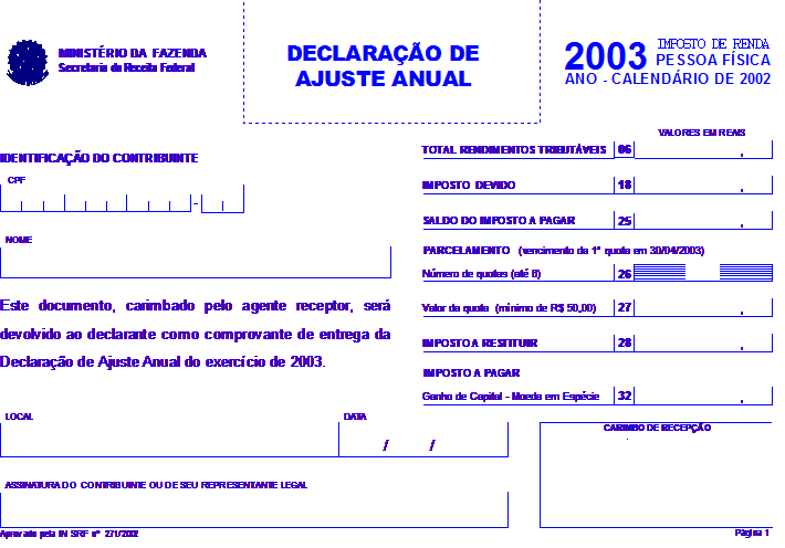 O SECRETÁRIO DA RECEITA FEDERAL, no uso da atribuição que lhe conferem os incisos III e XVIII do art. 209 do Regimento Interno da Secretaria da Receita Federal, aprovado pela Portaria MF nº 259, de 24 de agosto de 2001, e tendo em vista o disposto no art. 7º da Lei nº 9.250, de 26 de dezembro de 1995, e no art. 16 da Lei nº 9.779, de 19 de janeiro de 1999, resolve: Art. 1º Aprovar os formulários para a Declaração de Ajuste Anual do Imposto de Renda Pessoa Física do exercício de 2003, ano-calendário de 2002, conforme modelos em anexo, a serem impressos em papel off set branco de primeira qualidade, com a observância das seguintes especificações: I - Declaração de Ajuste Anual, com quatro páginas, no formato revista (entre 202 e 210 mm de largura e entre 266 e 280 mm de altura), na gramatura de 75 g/m2 e impressão na cor azul, código Pantone 299 U (Anexo I); II - Declaração de Ajuste Anual Simplificada, com duas páginas, no formato revista (entre 202 e 210 mm de largura e entre 266 e 280 mm de altura), na gramatura de 75 g/m2 e impressão nas cores verde escuro e verde claro, código Pantone 555 U (Anexo II); III - Demonstrativo da Apuração dos Ganhos de Capital, com duas páginas, no formato revista (entre 202 e 210 mm de largura e entre 266 e 280 mm de altura), na gramatura de 75 g/m2 e impressão na cor preta (Anexo III); IV - Demonstrativo da Apuração dos Ganhos de Capital - Alienação de Bens ou Direitos ou Liquidação ou Resgate de Aplicações Financeiras Adquiridos em Moeda Estrangeira, com uma página, no formato revista (entre 202 e 210 mm de largura e entre 266 e 280 mm de altura), na gramatura de 75 g/m2 e impressão na cor preta (Anexo IV); V - Demonstrativo da Apuração dos Ganhos de Capital - Alienação de Moeda Estrangeira Mantida em Espécie, com uma página, no formato revista (entre 202 e 210 mm de largura e entre 266 e 280 mm de altura), na gramatura de 75 g/m2 e impressão na cor preta (Anexo V); VI - Demonstrativo da Atividade Rural Exercida no Brasil, com duas páginas, no formato revista (entre 202 e 210 mm de largura e entre 266 e 280 mm de altura), na gramatura de 75 g/m2 e impressão na cor preta (Anexo VI); VII - Demonstrativo da Atividade Rural Exercida no Exterior, com duas páginas, no formato revista (entre 202 e 210 mm de largura e entre 266 e 280 mm de altura), na gramatura de 75 g/m2 e impressão na cor preta (Anexo VII); VIII - Recibo de Entrega da Declaração de Ajuste Anual, com duas páginas, formato A5 de 148 mm x 210 mm, na gramatura de 75 g/m2 e impressão na cor azul, código Pantone 299 U (Anexo VIII). Art. 2º Os formulários a que se referem os incisos IV e V do art. 1º e as respectivas instruções para seu preenchimento estarão disponíveis na página da Secretaria da Receita Federal na Internet, no seguinte endereço: <http://www.receita.fazenda.gov.br>. Art. 3º As empresas interessadas ficam autorizadas a imprimir e a comercializar os formulários de que trata esta Instrução Normativa. § 1º As artes-finais para impressão dos formulários serão fornecidas pela Divisão de Tecnologia e Segurança da Informação (Ditec) das Superintendências Regionais da Secretaria da Receita Federal. § 2º Os formulários destinados à comercialização deverão conter, no rodapé, o nome e o número de inscrição no Cadastro Nacional da Pessoa Jurídica (CNPJ) da empresa impressora. § 3º Os formulários que não atenderem às especificações contidas neste ato estarão sujeitos à apreensão pelas autoridades da Secretaria da Receita Federal. Art. 4º Esta Instrução Normativa entra em vigor na data de sua publicação. Art. 5º Fica formalmente revogada, sem interrupção de sua força normativa, a Instrução Normativa SRF nº 135, de 15 de fevereiro de 2002. EVERARDO MACIEL (*) Retificação incluindo os Anexos publicada no DOU de 6.1.2002. (**) As páginas 2 e 4 do anexo I e o Anexo VIII foram republicados no DOU de 9.1.2003, por terem saído com incorreção no original.
