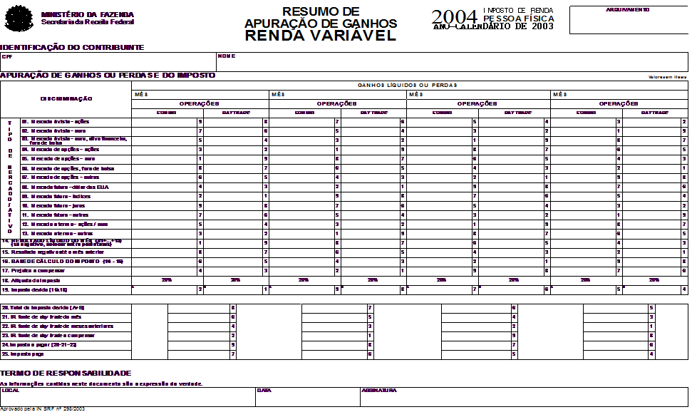 ANEXO ÚNICO Resumo de Apuração de Ganhos - Renda Variável Exercício de 2004 Ano-Calendário de 2003 Informações Gerais Obrigatoriedade de preenchimento Este formulário deve ser preenchido pelo contribuinte pessoa física, residente no Brasil, que durante o ano-calendário de 2003 efetuou: 1. alienação de ações no mercado à vista em bolsa de valores; 2. alienação de ouro, ativo financeiro, no mercado disponível ou à vista em bolsa de mercadorias e de futuros ou diretamente junto a instituições financeiras; 3. operações nos mercados a termo, de opções e futuro, realizadas em bolsa de valores, de mercadorias e de futuros, com qualquer ativo; 4. operações realizadas em mercados de liquidação futura, fora de bolsa, inclusive com opções flexíveis. O formulário será preenchido em duas vias e a 1ª via deve ser obrigatoriamente anexada à Declaração de Ajuste Anual, modelo completo, mesmo quando não houver ganhos líquidos oferecidos à tributação. Atenção Não é necessário anexar via do formulário à Declaração de Ajuste Anual Simplificada. Dispensa de preenchimento Não deve preencher este formulário o contribuinte que tenha: 1. auferido, exclusivamente, rendimentos pré-determinados em operações box, em vendas cobertas no mercado a termo, e em outras operações de financiamento realizadas em bolsa ou no mercado de balcão; 2. efetuado operações de mútuo e de compra vinculada à revenda, tendo por objeto ouro, ativo financeiro; 3. operações isentas, assim entendidas aquelas cujos ganhos líquidos auferidos em operações no mercado à vista de ações nas bolsas de valores e em operações com ouro, ativo financeiro, cujo valor das alienações realizadas em cada mês seja igual ou inferior a R$ 4.143,50, para o conjunto de ações e para o ouro, individualmente, salvo se tiver intenção de compensar eventual prejuízo. Os rendimentos dos itens "1" e "2" acima são tributados na fonte de acordo com as normas aplicáveis às operações de renda fixa. Procedimentos para Apuração dos Ganhos Líquidos ou Perdas Despesas de Corretagens, Taxas e Outros Custos Na apuração dos ganhos líquidos ou perdas, as despesas com corretagens, taxas ou outros custos necessários à realização das operações, desde que efetivamente pagas pelo contribuinte, podem ser acrescentadas ao custo de aquisição ou deduzidas do preço de venda dos ativos ou contratos negociados. Mercados à Vista (Ações e Ouro, Ativo Financeiro, Inclusive Fora de Bolsa) O custo de aquisição dos ativos negociados nos mercados à vista é calculado pela média ponderada dos custos unitários, por espécie de ativo, de acordo com os seguintes procedimentos: 1. some os valores referentes às compras do ativo realizadas até a data da operação de venda do mesmo ativo; 2. por ocasião da venda, divida o valor encontrado no item "1" pela quantidade do ativo em seu poder, obtendo o valor de cada ação ou de cada grama de ouro. Esse valor, multiplicado pela quantidade de ações ou de gramas de ouro vendida, representa o custo médio de aquisição; 3. na hipótese de venda parcial, o valor do estoque remanescente é ajustado, subtraindo-se do valor encontrado no item "1" o custo médio do ativo vendido. O ganho líquido é obtido pela diferença positiva entre o valor da operação de venda e o do custo médio do ativo vendido. Atenção Caso se tenha feito uso da faculdade de pagar o imposto sem a efetiva venda das ações, conforme previsto nos arts. 1º e 2º da Lei nº 10.426, de 24 de abril de 2002, o custo de aquisição, para efeito de apuração do imposto quando da efetiva alienação, será o preço médio ponderado constante das relações de que tratam os Anexos I e II da Instrução Normativa SRF nº 119, de 10 de janeiro de 2002. Mercados de Opções Operações tendo por Objeto a Negociação das Opções de Compra ou de Venda (Sem Exercício) 1. Posição titular O custo de aquisição das opções de mesma série é calculado pela média ponderada dos prêmios unitários pagos. O ganho líquido é obtido pela diferença positiva entre o valor da operação de encerramento das opções de mesma série (valor recebido pela venda de opções) e o seu custo médio de aquisição. 2. Posição lançadora Para apurar o ganho líquido, adote os seguintes procedimentos: a) some os valores dos prêmios referentes às opções lançadas, recebidos até a data da operação de encerramento, em opções de mesma série; b) por ocasião do encerramento, divida o valor encontrado em "a" pela quantidade de opções de mesma série lançadas até aquela data, apurando o valor médio do prêmio recebido em cada opção; c) na hipótese de encerramento parcial, o valor das opções remanescentes é ajustado, subtraindo-se do valor encontrado em "a" o valor calculado em "b", multiplicado pela quantidade de opções objeto da operação de encerramento. O ganho líquido é obtido pela diferença positiva entre o valor médio do prêmio recebido em cada opção multiplicado pela quantidade de opções de mesma série objeto da operação de encerramento e o valor desta operação. Operações de Exercício da Opção 1. Opção de compra a) Titular O custo de aquisição é o preço de exercício do ativo acrescido do valor do prêmio pago. O ganho líquido é a diferença positiva entre o valor de venda à vista do ativo, na data do exercício, e o seu custo de aquisição. Ocorrendo a venda posteriormente à data do exercício, o ganho líquido é a diferença positiva entre o valor recebido pela venda do ativo e o custo médio de aquisição, apurado conforme estabelecido para o mercado à vista.