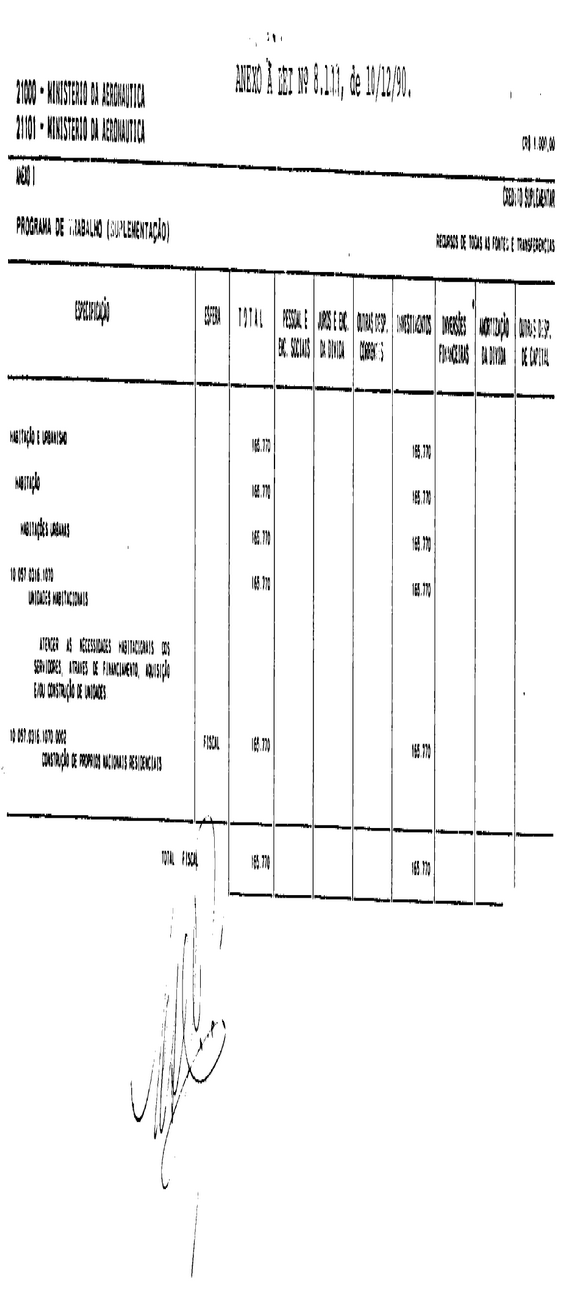 Art. 1° É o Poder Executivo autorizado a abrir ao Orçamento Fiscal da União (Lei n° 7.999, de 31 de janeiro de 1990), em favor do Ministério da Aeronáutica, crédito suplementar no valor de Cr$ 165.770.000,00 (cento e sessenta e cinco milhões, setecentos e setenta mil cruzeiros), para atender à programação constante do Anexo I desta lei.